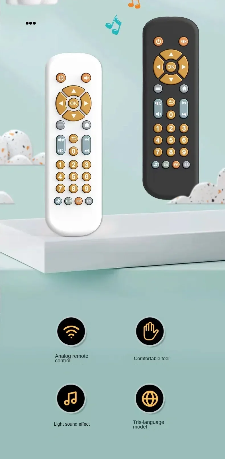 👶 Realistic Design Babies love to imitate Mom and Dad! The authentic shape and button layout satisfy their curiosity and encourage imaginative role-play. Now they can "control" the TV alongside you.